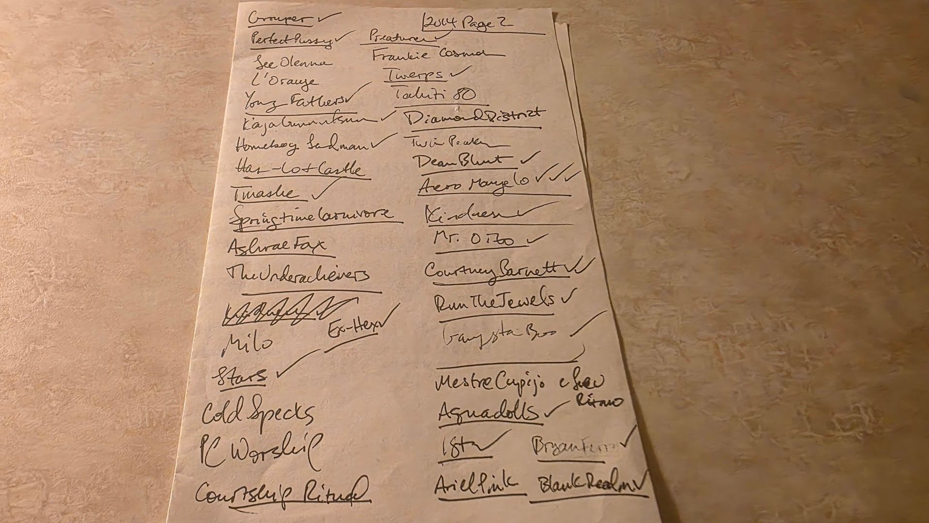 There is a second problem I realized when I was going through this sheet: not all of this music was released in 2014. For example, you’ll see toward the top of the list a band called Twerps. I wrote about Twerps when I discussed indie pop in the Antipodes. Twerps is an fantastic band. They also did not release an album in 2014. They released an album in 2011. I listened to that album a lot in 2014, but that album was not new. On the other side of this page (which I’m not posting because it has a phone number on it and I’m not doing any photoshopping today), I have The Spits, a Pacific Northwest punk/garage band that crushes, written down. They didn’t release an album in 2014 either. Listened to Kill The Kool a lot that year, but it was from 2010.